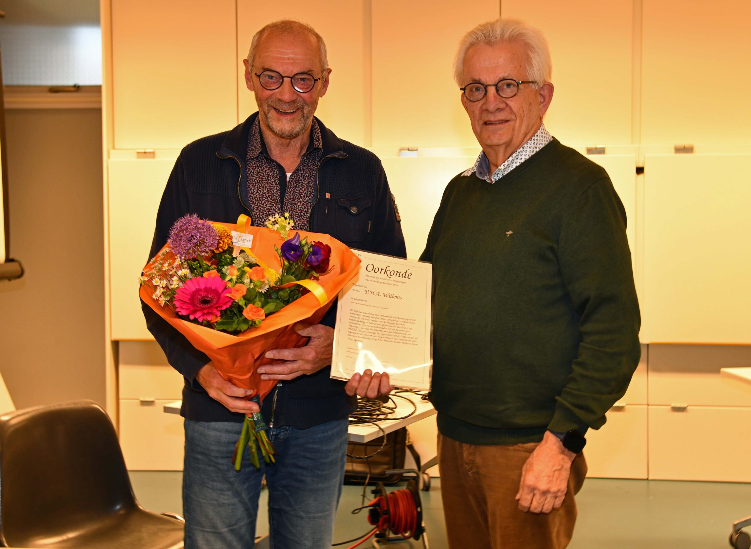 Bij gelegenheid van de viering van het gouden jubileum van heemkundekring Felix Walter in Langenboom heeft Brabants Heem voorzitter Henk Hellegers twee verdienstelijke leden van de kring met een zilveren