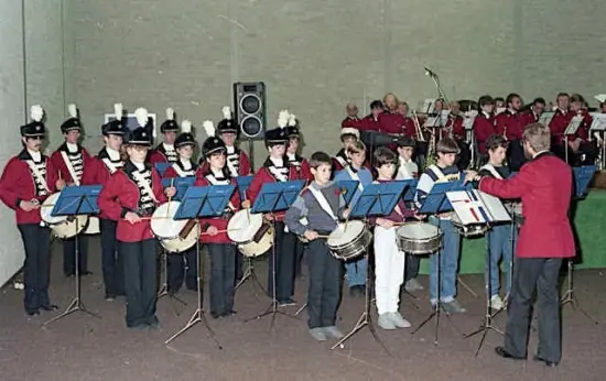 Drumband vooraan: Rianne Verhallen – Jos Koenen . Sjaak Schaap . Frans van Ras . Nico Peters – Jos Kuijpers – Mirjam van der Meijden – Wilco Vervoort – Albert Kuijpers en Sjef Verstegen
