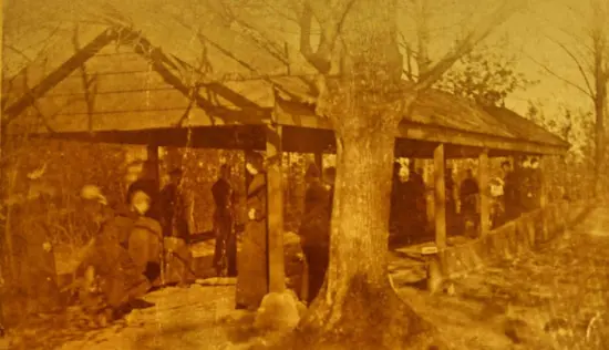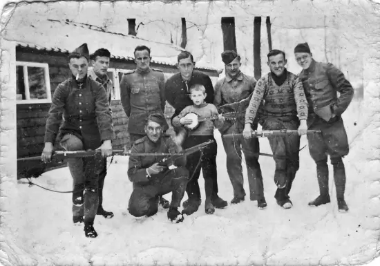 Gemobiliseerde soldaten bij de kegelbaan van Russendaal. De jongen met de banjo is Theo Lukassen