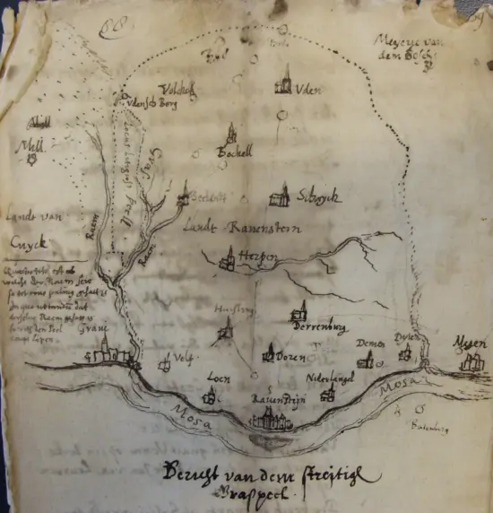 Oude tekening uit 1301, waarop aan de linkerzijde verschillende stippellijnen staan, die de grensverschillen aangeven over de Graspeel, tussen het Land van Cuijk en het Land van Ravenstein. Ook bij de adbijboerderijen stond de grens niet precies vast.
