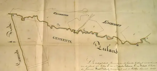 Kaartje uit 1838, waarop duidelijk te zien is, dat de huidige Scheiwal, toen in 1838 vanaf de Vliesweg richting De Zandvoort, zeer erg kronkelde. Dit is enkele jaren terug weer zo hersteld, nadat het in 1841 was rechtgetrokken.