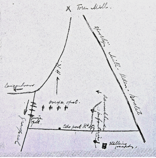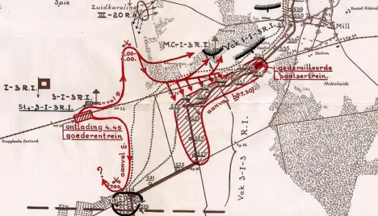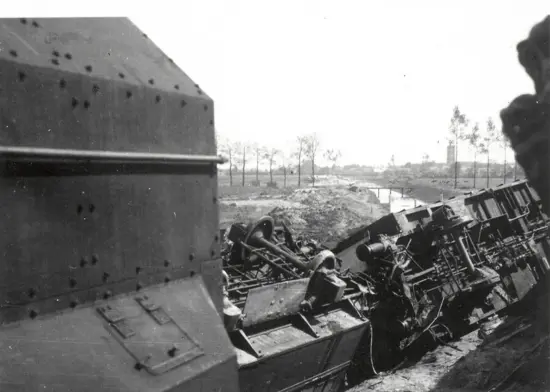 Luitenant Fennell, die nog vooraan zat, meldde rond half 5: “Een pantsertrein met daarachter een goederentrein …. rijdt door …. stopt een eind achter het front ….. pas op vijandelijke soldaten in de rug”. Meteen ging men op de uitkijk staan. Enige tijd later hoorde men een enorme herrie. De pantsertrein was op de terugtocht ontspoord, omdat hij op zg. asperges op het spoor knalde. Die had men snel geplaatst.
