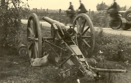 Hun gewonden werden naar de stal van het Pannenhuis gebracht, de boerderij van Frans Thelosen aan het einde van de Dellenweg.) Ondertussen werden onder leiding van opperwachtmeester Nikkel de kanonnen van de rechterbatterij van de hei af gesleept en op de Dellenweg naast elkaar opgesteld, zodat ze nu alle 4 tegelijk konden vuren. Mulder schreeuwde in de telefoon: “Volhouden, misschien halen we het.” Ze waren al op ongeveer 300 meter genaderd. Mulder keek, de Duitse aanval was verlangzaamd, zag hij het goed? Stopten ze? Ja waarachtig, ze aarzelden – bangg – bangg – de granaten sloegen vanaf korte afstand tussen hen in. Ja, ze begonnen te wijken. “Volhouden, doorgaan”. De Duitsers vloeiden terug – dit was hen te machtig – dit hadden ze niet verwacht. “ 50m verder naar achteren richten, ze gaan terug, jaag ze weg – bangg – bangg”. Uiteindelijk klonk het verlossende “ houd op vuur – bravo jongens – dit was een geweldig stukje samenwerking”. Men was ong. één uur aan het vuren geweest. Alleen de 4 kanonnen van de rechterbatterij hadden samen al 158 granaten afgevuurd, daar kwamen de vele granaten van de andere vuurmonden nog bij. Tezamen hadden ze een prestatie geleverd, uniek in de militaire historie. Nog nooit vertoond. De Duitse opmars bij Mill was ernstig vertraagd.