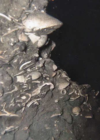 De duikers onderzochten de steile wand die was ontstaan door het instorten van een deel van die wand bij het zuigen. Als al het fijne zand was neergedwarreld en men beperkt iets kon zien, zag men dat op een diepte van 15 tot 20 meter onder het oppervlak zich zanden bevonden, die nauwelijks fossielen bevatten, allen kleine wervels en botjes van vissen. Deze laag is ontstaan tussen 11 en 8,7 miljoen jaar geleden.