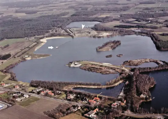 Luchtfoto de Kuilen in 2006: Bij de pijl in het water ligt de zandzuiger, de pijl omlaag wijst de plaats aan, waar het zand werd opgespoten