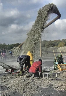 De machine spoot met grote kracht water vlak bij de bodem in de wand. Zo werd er een gat uitgehold, dat op een bepaald moment zo diep was, dat de wand instortte. Dan werd het losgemaakte zand opgezogen en via pijpen naar de opvangbassins vervoerd. Er waren twee grote bassins met een totale omvang van enkele voetbalvelden. Zodra een bassin vol was en het water weggelopen, werd het leeggegraven en het zand afgevoerd; tegelijkertijd begon men met het volspuiten van het tweede bassin.