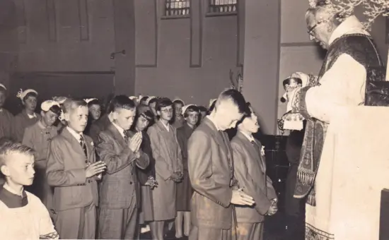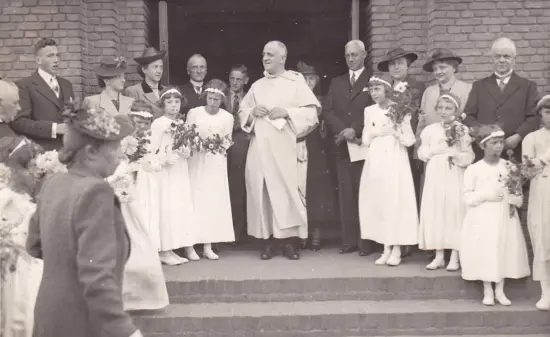 Plechtige communie bij pastoor De Boer. Klaar staan o.a. Christ Kuppen – Theo v.d. Wiel en Fientje Hendriks (met bril). Misdienaar Koos de Klijn.