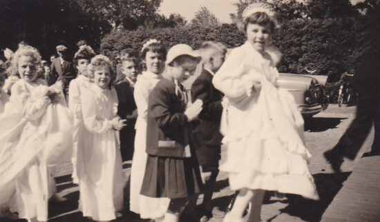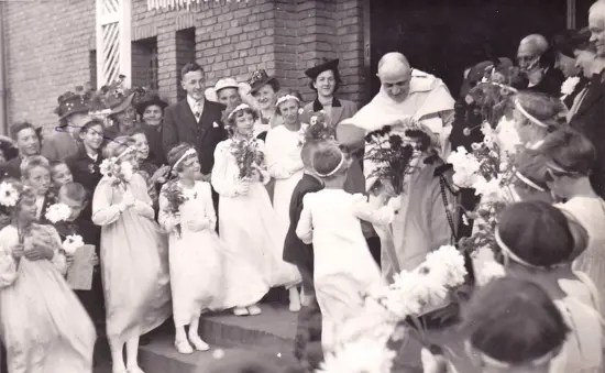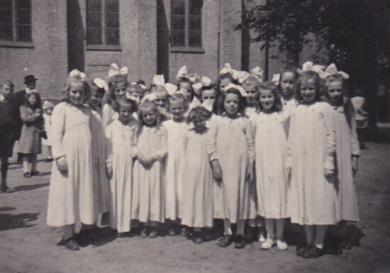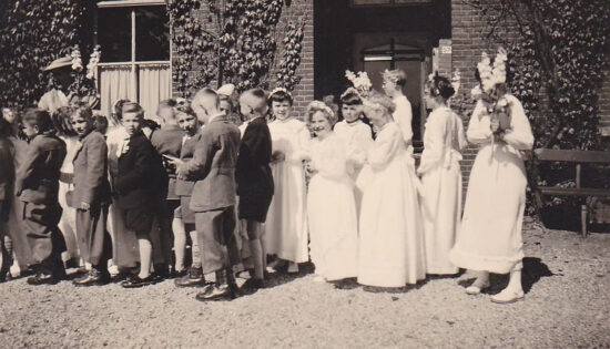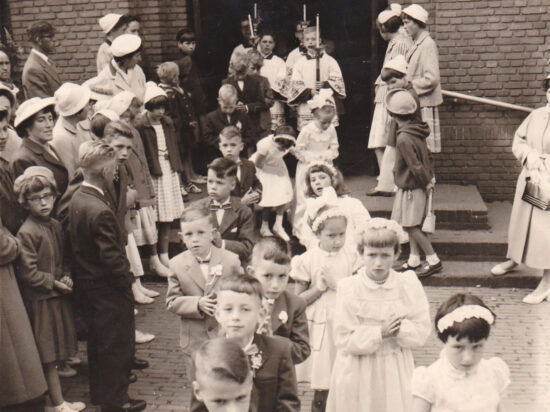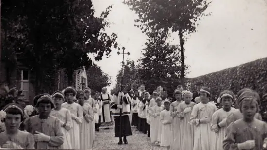 Wie deden de 1e Communie, hier op weg van het klooster naar de kerk.?