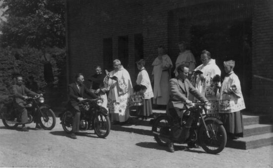 Pastoor De Boer zegent in 1953 de motoren van Wim van Schayik – Jan Roefs en