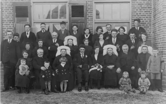 Beneden: Dina Nuijen-Thoonen met op schoot: Jo Nuijen – De ouders van Jo: Bart Bens en echtgenote – Jo en Nelleke – Mina en Martien Jans – Mina Thoonen en Jo Thoonen. Zittend: Pieta Nuijen en Ria v.d. Cruijsen