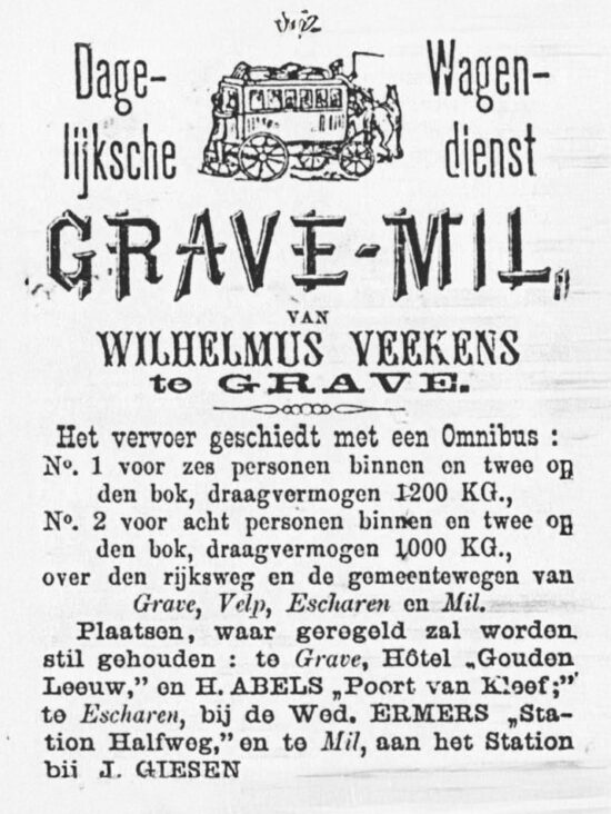 Een klein stukje vanuit ’t Hoekske richting Mill was voor 1870 de herberg te vinden van Ermert Ermers. Tevens had hij een bakkerij met winkel. Ook boerde hij er nog volop bij. Omdat in 1873 de spoorlijn Boxtel-Wesel geopend werd, kwam er vanaf september 1874 een Koetswagendienst tot stand tussen het station in Mill en Grave. De koets reed 2 keer per dag op en neer en stopte halverwege bij de herberg van Ermert Ermers. Deze koets vervoerde post en personen. Spoedig hierna kreeg deze herberg de naam “Station Halfweg”. Toen de beide ouders gestorven waren, (Ermert al in 1881) verkochten in mei 1887 de kinderen Ermers het aan Hein Schoonwater. Net als zijn zoons Eduard en Piet was Hein naast herbergier ook hoefsmid. Voetbalclub “Excelsior” had er zijn thuishaven en speelde er ook toneel. In 1939 verdween de herberg.