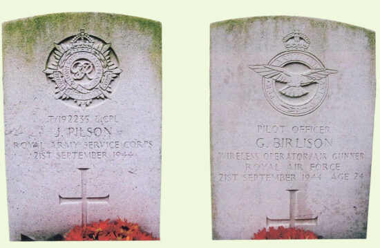 Ook met jachtvliegtuigen voerde men aanvallen uit. Tijdens zo’n aanval op 21 september werd een Dakota vliegtuig zodanig geraakt, dat het onbestuurbaar werd. Dat werd hen boven Langenboom noodlottig. Van de bemanning probeerden 6 personen zich per parachute in veiligheid te stellen..Tijdens het dalen werden de Engelse officier en radio-operator Gordon Birlison (24 jaar) en korporaal James Pilson veelvuldig geraakt door kogels uit mitrailleurs vanuit de Duitse jachtvliegtuigen. Ze kwamen zeer hard neer bij de Gasthuisstraat, in de buurt van het huis waar nu Jan van Dalen woont. De Dakota stortte daarna brandend neer op vliegveld Volkel waarbij de 2 piloten omkwamen.