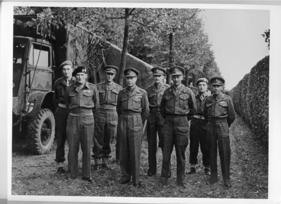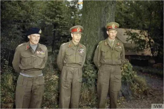 Koning George VI in het midden , geflankeerd links door veldmaarschalk Montgomery en rechts generaal Dempsey. De overigen zijn stafleden.