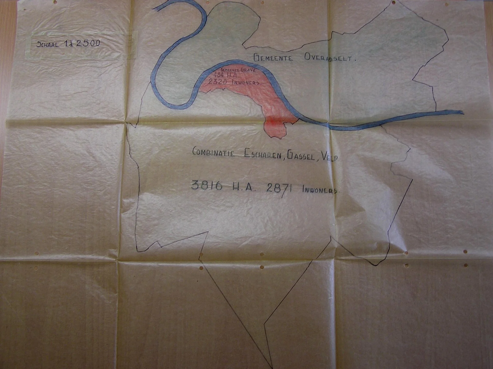 De nieuwe gemeente Escharen-Gassel-Velp zou een oppervlakte krijgen van 3816 ha met een zielental van 2871, terwijl Grave daarneven zou liggen met een oppervlakte van 404 ha (waarvan in de wintermaanden meerdere malen ong. 5-6 gedeelte onder water staat), en een zielental van 2320.