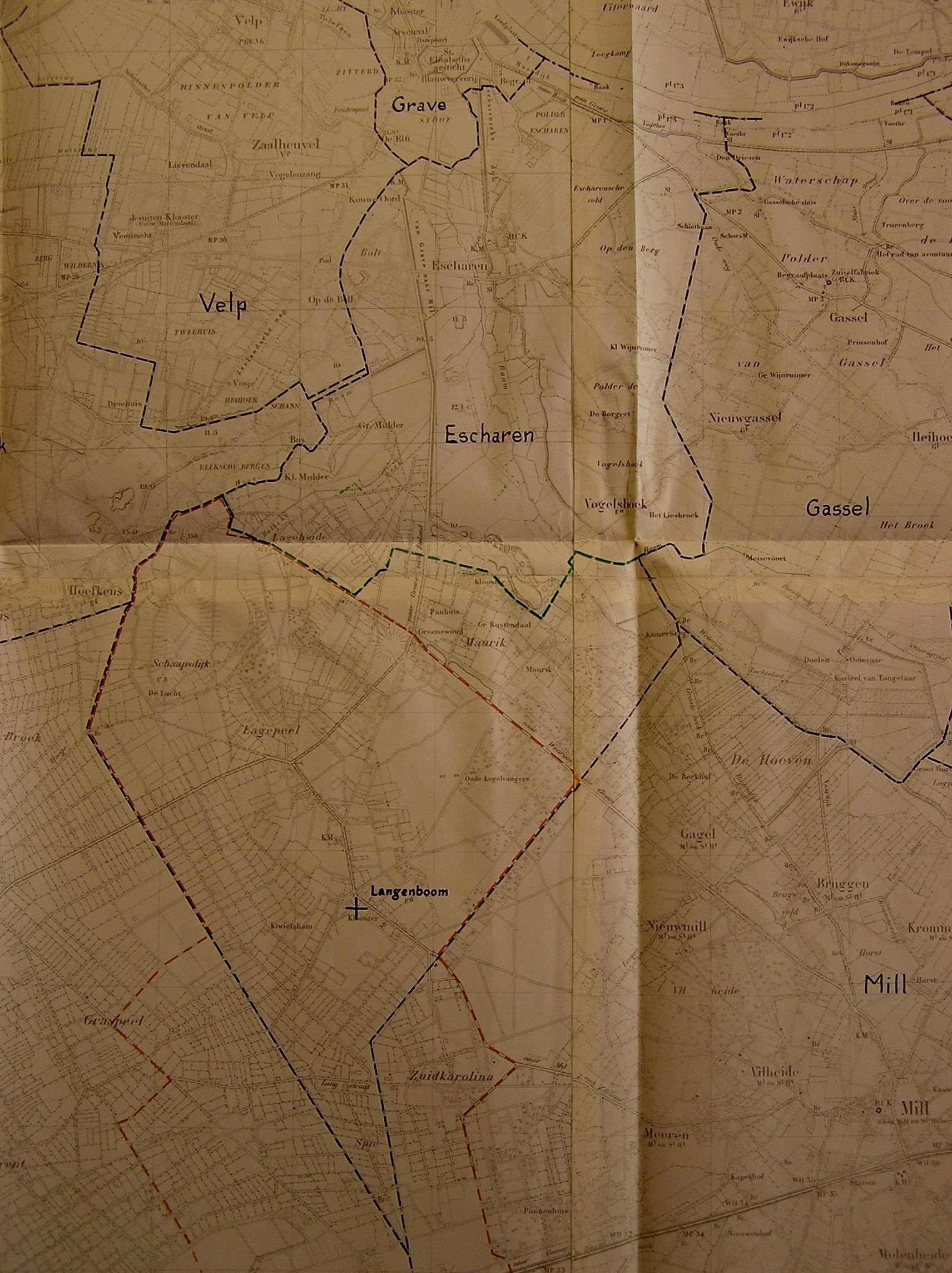 Op de kaart van 20 juni 1933 hebben wij het grondgebied aangeduid, omvattende de gemeenten Grave, Velp, Reek, Escharen en Gassel, welk gebied naar ons oordeel tot één gemeente zou kunnen worden gevormd, mogelijk met uitzondering van een gedeelte van de gemeente Escharen, hetgeen misschien beter ware te voegen bij de gemeente Zeeland of Mill c.a.