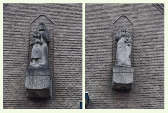 Eén grote uitdaging bleef nog over. In de voorgevel van de kerk waren sinds 1926 twee grote nissen, maar er stonden geen beelden. Daar wilde de RKJB wel haar medewerking aan geven om het benodigde geld bijeen te brengen. Zij startte de actie “Oud ijzer, nieuwe beelden”. In 1953 en 1954 werd er voldoende geld, zijnde fl. 4.000,= opgehaald om de kunstenaar Henk van den Idsert, een neef van kapelaan Van den Idsert aan het werk te zetten. Uit grote blokken Belgisch marmer, genaamd “Marbre-de Neuville” hakte hij een Mariabeeld met lelie en St. Jozef met kind. Samen de H. Familie. Het was zijn bedoeling om beelden te plaatsen die niet van de tijd waren, maar boven de tijd. Volgens de kroniekschrijver van de Dominicanen lijkt de uitvoering iet of wat Egyptisch, maar was het volgens hem zeer geslaagd. Zij werden in oktober 1954 in de nissen geplaatst.
