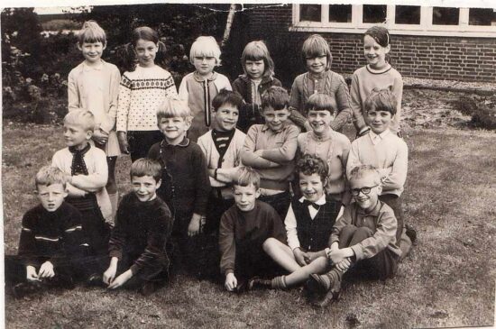 Staand: Meester Toon Ermers – Gonny Straatman – Tonny Verstraten – Marco Gelden – Frans Kuijpers – Jan Kuijpers – Micheline Schmitz – Benny Hol – Huub Lammers – Anita Verstegen en juffr. Van Gent