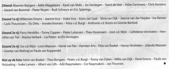 4e rij: Karin van Duijnhoven – Carla Kremers – Gertie Theunissen – Johnny Arts – Maarten Verstraten – Gerard v.d. Elzen – Jos Kuijpers – Antoinet Kersten – Liesbeth Broekman en Lianne Bongers.