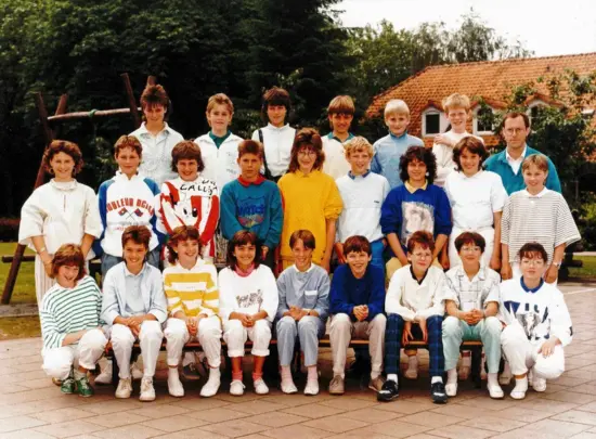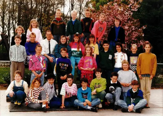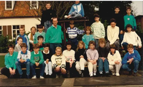 1e Rij staand: Twan van Hout – meester Martien Arts – Frank van Limbeek – Ans Rongen – Sonja de Klein – Anita Vervoort – Claudia Hendriks – Herwin Hopmans – Pim de Klein – Johnny Kremers – Chiel v.d. Horst – Arjan Emons – Eugène Verstegen – Hedwig Rigters – Hedwig Arts – meester Toon Ermers en Eddie Strijbosch