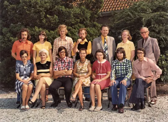 Boven: Truus vd Wiel – Toon Ermers (directeur) – Jan Rossen (concierge) – Pauline Daverveld – Gert-Jan Bardoel – Anny van Gent-Kuijpers – Jacques Kusters – Thecla Oosterkamp-Roemer – Ton van Erp en Marjan van Raaij-Moors