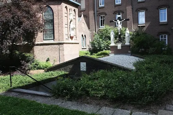 Het klooster in Huissen rond de eeuwwisseling 1900. Rechts op het veldje naast de ingang van de kapel is tegenwoordig de grafkelder gelegen. Daar is Thomas Van Hoogstraten te ruste gelegd