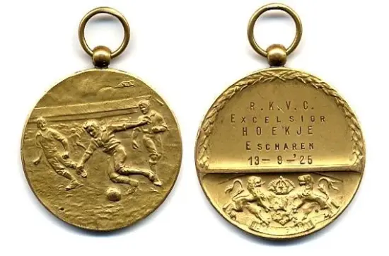 Het voetbal was in opkomst, vrijwel iedere grotere buurtschap had wel een vriendengroep die samen voetbalde en ook ’t Hoekje kon niet achterblijven. Voetbalclub “Excelsior” zag het levenslicht in café “Station Halfweg”. Eigenaar was Hein Schoonwater. Men speelde vriendschappelijke wedstrijden of toernooien, want een competitie was er nog niet. Zo voetbalde men ook tegen voetbalclub “Juliana” op ’t Oventje. Ja, VCO had al een vroege voorloper. Daar voetbalde men op een heideveld nabij café “De Hut” vlak bij de spoorlijn aan de Boekelsedijk. Onderstaande medaille troffen we aan op ’t Oventje in een oude schoenendoos.