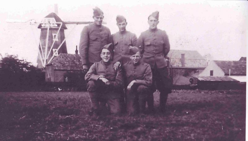 Gemobiliseerde soldaten poseren achter het huis van de gebr. van Huisseling en de molen