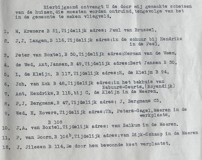 De woning van Lamb. de Kleijn (waar nu de achterste accommodatie bij De Kuilen staat) werd onbewoonbaar. De huizen van Wed. Rovers - A. Lange - H. Hendriks en J. Jilessen moesten verlaten worden voor de aanleg van het vliegveld.