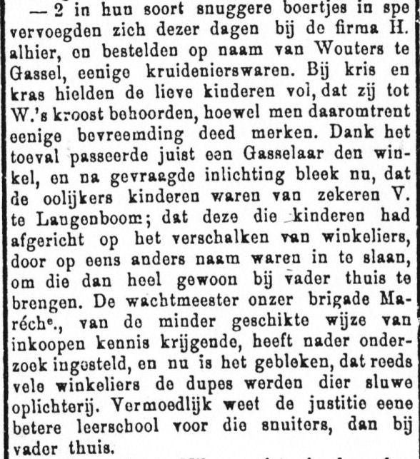 Het begon in juli 1892 in een winkel in Grave, waarover de Graafse correspondent in deftige taal schrijft. (De 2 snuggere boertjes in spe zijn twee kinderen.)