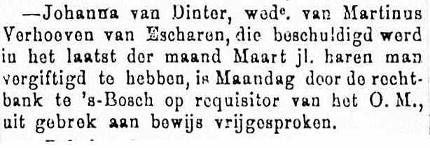 “- Zaterdag stond voor de arrond.-rechtbank te ’s-Bosch terecht Johanna van Dinther te Langenboom, thans gedetineerd, beklaagd ter zake, dat zij, na het voornemen te hebben opgevat en het besluit genomen om haren echtgenoot Martinus Verhoeven van het leven te berooven, den 27 Maart 1893 te Langenboom, opzettelijk ter uitvoering van het misdadig besluit, dien echtgenoot eene hoeveelheid zwavel (phosphorus) heimelijk heeft toegediend en heeft doen eten, ten gevolge waarvan genoemde Martinus Verhoeven ernstig ziek geworden is en op den 31 Maart 1893 gestorven is.