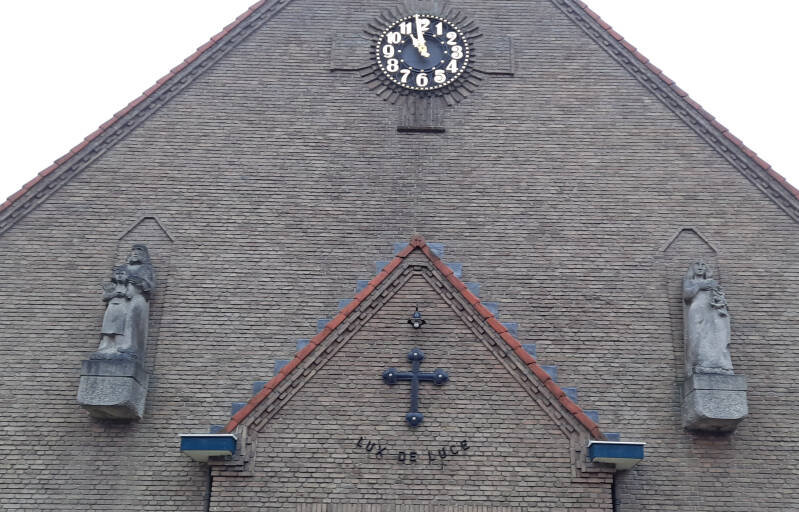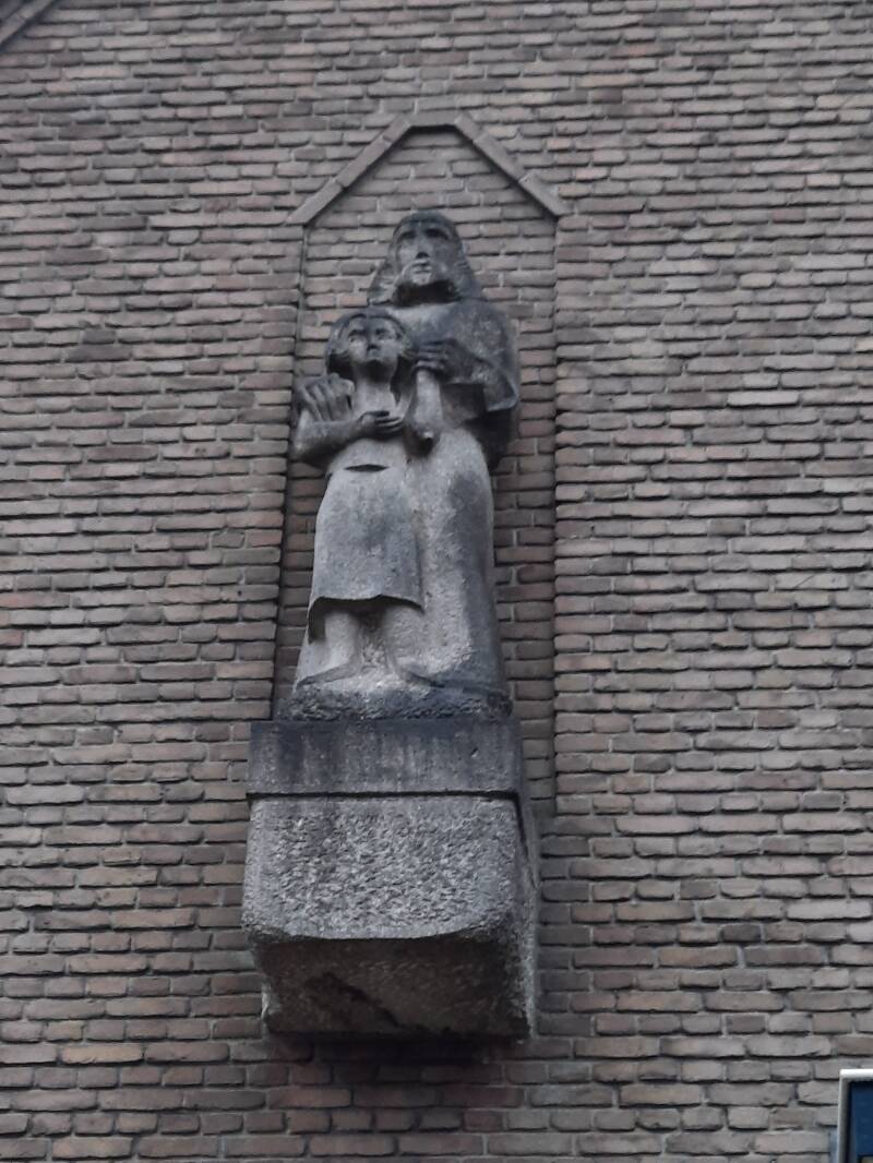 Eén grote uitdaging bleef nog over. In de voorgevel van de kerk waren sinds 1926 twee grote nissen, maar er stonden geen beelden. Daar wilde de RKJB wel haar medewerking aan geven om het benodigde geld bijeen te brengen. Zij startte de actie “Oud ijzer, nieuwe beelden”. In 1953 en 1954 werd er voldoende geld, zijnde fl. 4.000,= opgehaald om de kunstenaar Henk van den Idsert, een neef van kapelaan Van den Idsert aan het werk te zetten. Uit grote blokken Belgisch marmer, genaamd “Marbre-de Neuville” hakte hij een Mariabeeld met lelie en St. Jozef met kind. Samen de H. Familie. Het was zijn bedoeling om beelden te plaatsen die niet van de tijd waren, maar boven de tijd. Volgens de kroniekschrijver van de Dominicanen lijkt de uitvoering iet of wat Egyptisch, maar was het volgens hem zeer geslaagd. Zij werden in oktober 1954 in de nissen geplaatst.