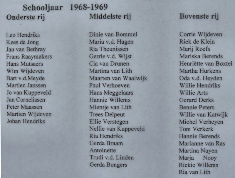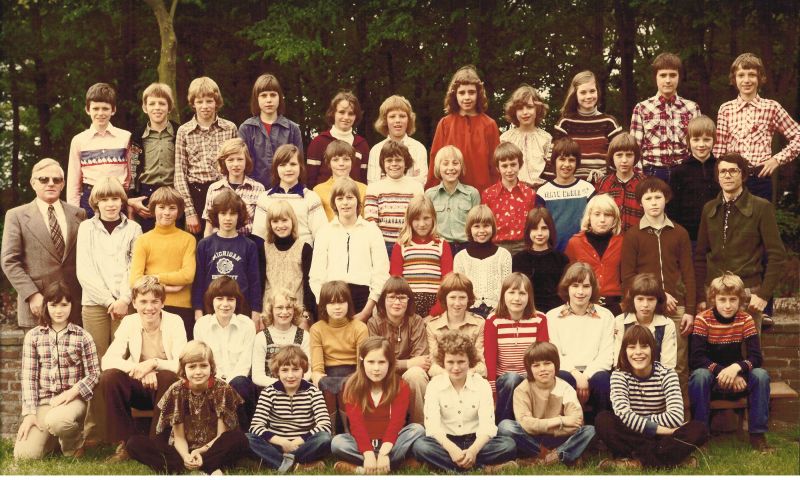 4e rij staand: Martien Arts - Paul Thelosen - David Nooijen - Marcel Maassen - Leon Regter - Petra van Boxtel - Thijs Reinen - Toine van Gaal - Jolanda Verstraten - Anky Bol - Helmi Verstraten en meester Toon Ermers.