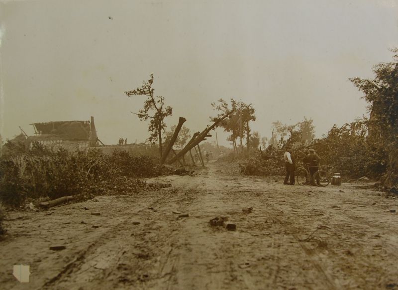 Eeuwenoude bomen waren afgeknapt en ontworteld, daartussen en tot hoog in de takken lag en hing de oogst van de hooi- en korenmijten, die uiteen geslagen waren. Wat nog meer een troosteloos gezicht gaf waren de dode vogels en kippen, wasgoed en kledingstukken, klein huisraad, pannen en stenen lagen in de wonderlijkste mengeling dooreen.