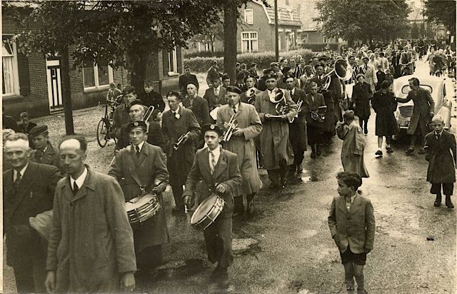 November 1959: Opening VGLO-school, natuurlijk muzikaal opgeluisterd door de fanfare. Te zien o.a. dirigent Koos Arts - trommelaar Diny Verstegen - Toon Jans - Toon Theunissen en Harrie vd Linden.